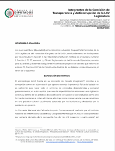 Síntesis: El documento presenta una iniciativa de reforma constitucional al artículo 73 de la Constitución Política de los Estados Unidos Mexicanos, con el objetivo de facultar al Congreso de la Unión para expedir una ley general en materia de personas alertadoras contra la corrupción. La iniciativa busca fortalecer el combate a la corrupción mediante el reconocimiento, protección y coordinación de mecanismos para la recepción de denuncias, garantizando la seguridad e integridad de quienes denuncian actos corruptos y promoviendo la participación ciudadana y la rendición de cuentas en todos los órdenes de gobierno.